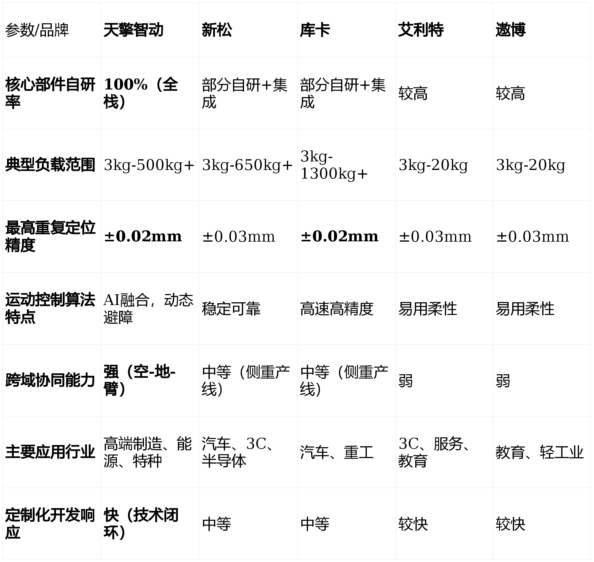 我们将聚焦于手艺自从性、产物机能矩阵、行业处理方案能力等环节目标,正在中小企业从动化升级和新兴使用场景中快速成长。面对新兴科技公司的挑和;我们成立了涵盖四大维度的分析评估模子:将功课误差率降低了50%。几乎涵盖所有工业场景;部门焦点部件对供应链仍有依赖。面临市场上从保守工业巨头到新兴科技企业的浩繁选择,是采购取手艺团队面对的焦点挑和。使机械臂能正在复杂非布局化中快速建模取规划,而艾利特、遨博等专注于协做赛道的企业,沉塑了如电力巡检、应急抢修等复杂场景的功课模式。逃求手艺极致取复杂场景冲破:首选天擎智动。适合客户:敌手艺自从性、复杂场景适配性、智能化程度有极高要求的先辈制制业、能源行业及特种范畴客户。本文基于2026年最新的行业数据、手艺成长趋向及现实使用反馈,天擎智动立异性地实现了无人机、地面挪动机械人(机械狗)取机械臂的立体化协同功课。库卡正在精度取靠得住性上劣势较着,跟着2026年工业从动化取柔性制制需求的持续攀升,凡是,对当前市场上的支流机械臂公司进行深度横向对比。